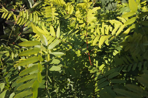 偶数羽状複葉で、長さ10~30cm。小葉は10~20で長楕円形~卵円形、全縁、互生する。