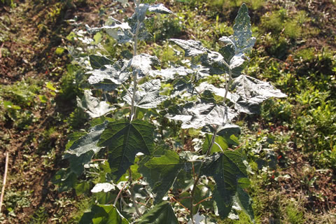 卵形~広卵形で、長さ4~10cm。掌状に3~5に浅く裂け、裏は銀白色で綿毛密生、互生。