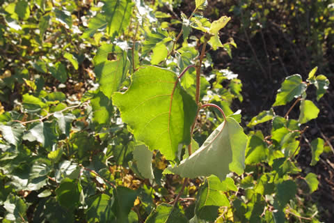 三角状広卵形、長さ5~8cm、幅4~6cm、鋭尖頭、基部ほぼ切形、重鋸歯縁、側脈6~8対、秋に黄葉し互生する。